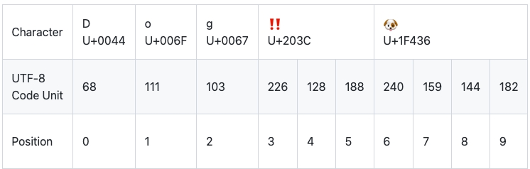// 68 111 103 226 128 188 240 159 144 182上面的例子中,前三个 10 进制 codeUnit 值(68、111、103)代表了字符 D、o 和 g,它们的 UTF-8 表示与 ASCII 表示相同。接下来的三个 10 进制 codeUnit 值(226、128、188)是 DOUBLE EXCLAMATION MARK 的3字节 UTF-8 表示。最后的四个 codeUnit 值(240、159、144、182)是 DOG FACE 的4字节 UTF-8 表示。